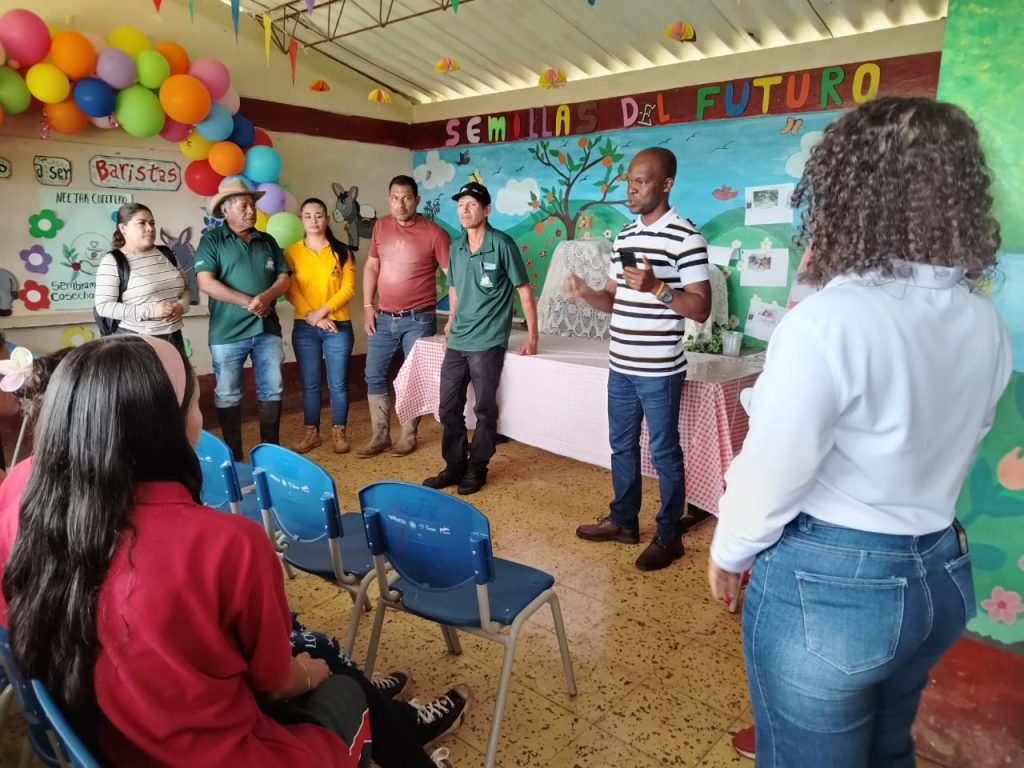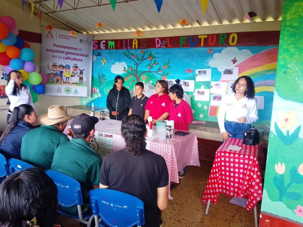 En la Institución Educativa San José, sede Murrapal, del municipio de Uramita, se vivió una jornada llena de sabores, aprendizajes y liderazgo gracias al equipo del proyecto Semillas del Futuro. Durante la actividad, 36 estudiantes fortalecieron sus habilidades sociales y de gestión a través del conversatorio “Presentando mi cafetal”, en el que participaron la Secretaría de Educación, la Secretaría de Agricultura, el Consejo de Juventud, el director de la institución, el Servicio de Extensión y representantes del Comité Municipal de Cafeteros. En este espacio, los jóvenes presentaron los logros alcanzados durante el año y entregaron oficialmente a la comunidad su proyecto de emprendimiento “Néctar Cafetero”, un cafetal con 800 plantas en su primera etapa de crecimiento, desarrollado con una inversión de $3.800.000 en insumos aportados por el Comité de Cafeteros de Antioquia y con la valiosa participación de estudiantes, familias y comunidad.