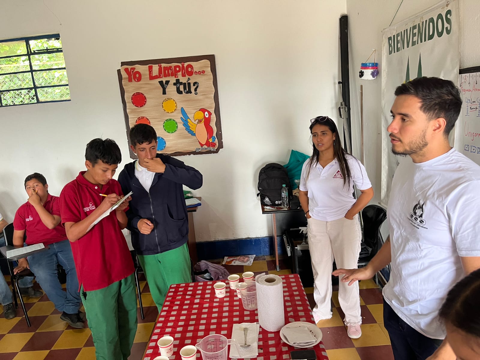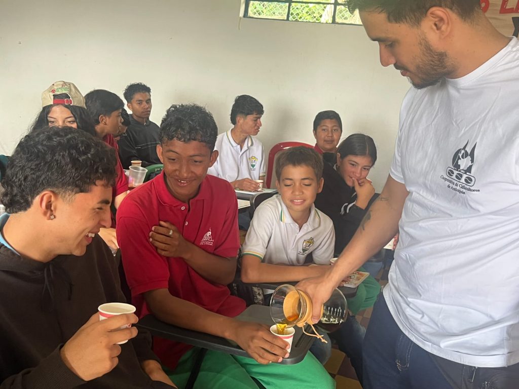 25 estudiantes de la IER San Rafael, en la vereda La Pradera de Heliconia, participaron en una jornada intensiva de dos días, para fortalecer sus conocimientos en barismo y catación. Los jóvenes aprendieron a utilizar métodos de preparación de café de alta complejidad, como la V60, Chemex y AeroPress, herramientas que les permitieron profundizar en el arte de preparar una bebida de calidad. Como incentivo, cada estudiante recibió una prensa francesa de parte del Comité de Cafeteros de Antioquia para continuar practicando y perfeccionando sus habilidades en casa. Al final de la jornada, se conformaron grupos de trabajo para idear la mejor taza de café de calidad, simbolizando un “árbol de café” y evaluando sus procesos y conocimientos adquiridos.
